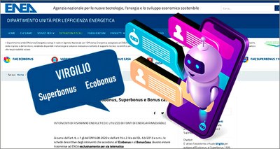 Virgilio è un software della piattaforma Userbot personalizzato dai tecnici Enea del laboratorio "Supporto attività programmatiche per l’efficienza energetica" ed è stato applicato in prima battuta al Superbonus, poi esteso all’Ecobonus e infine anche al Bonus Casa, di cui saranno resi noti a breve i dati statistici. Il nuovo servizio online di ENEA è un vero e proprio assistente virtuale che, a oggi, grazie all’intelligenza artificiale, ha risposto a migliaia di messaggi in media al giorno e oltre al 90% dei quesiti posti. Per interagire con l'assistente virtuale basta avviare la chat che si apre sulla pagina web dedicata e iniziare a scrivere messaggi sintetici, quando Virgilio non riesce a rispondere, è possibile consultare una seconda pagina che riporta i quesiti di natura tecnico-procedurale. I tecnici consigliano di inserire in chat messaggi sintetici e inerenti al quesito che si vuole sottoporre, per poter ottenere risposte coerenti.